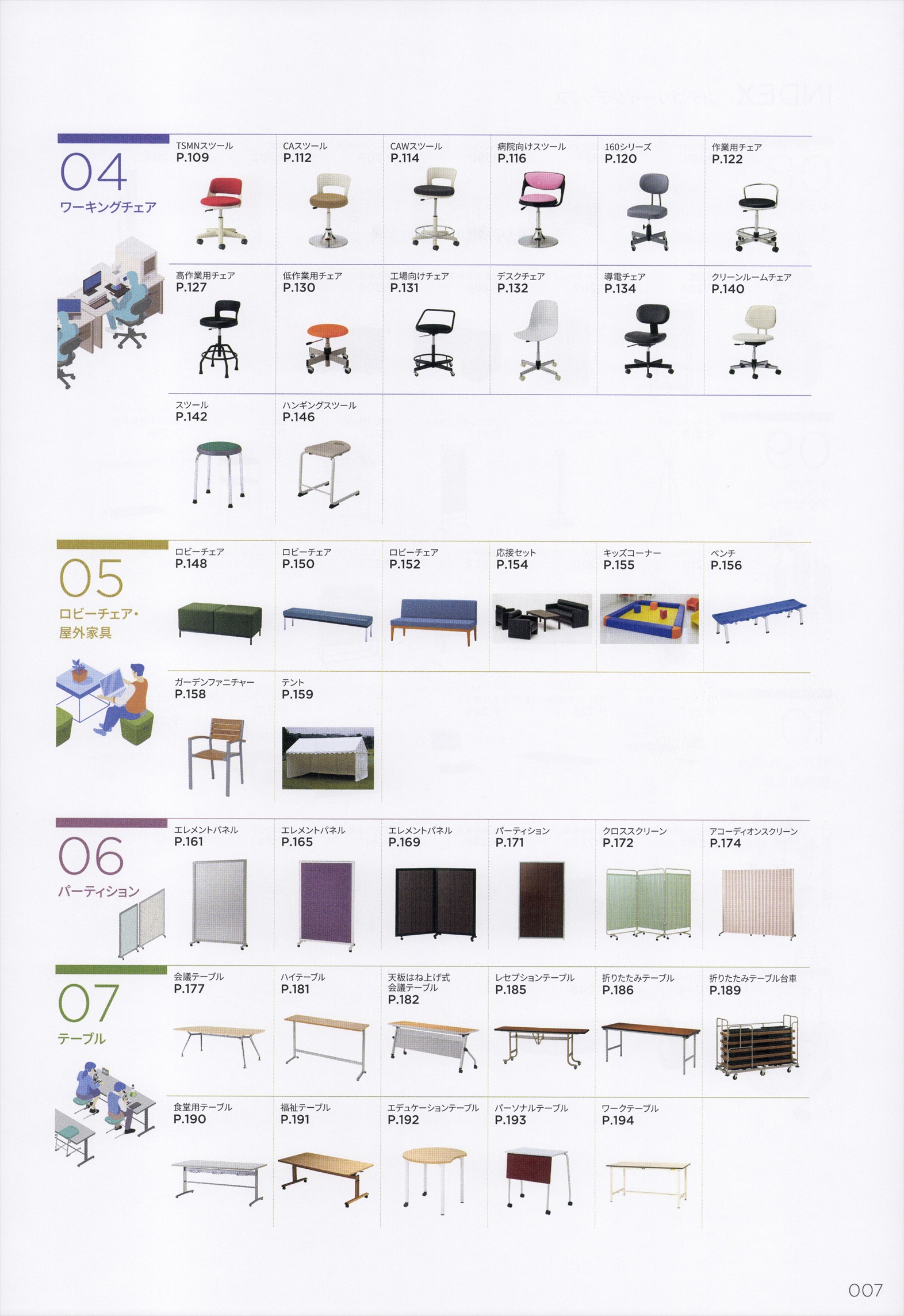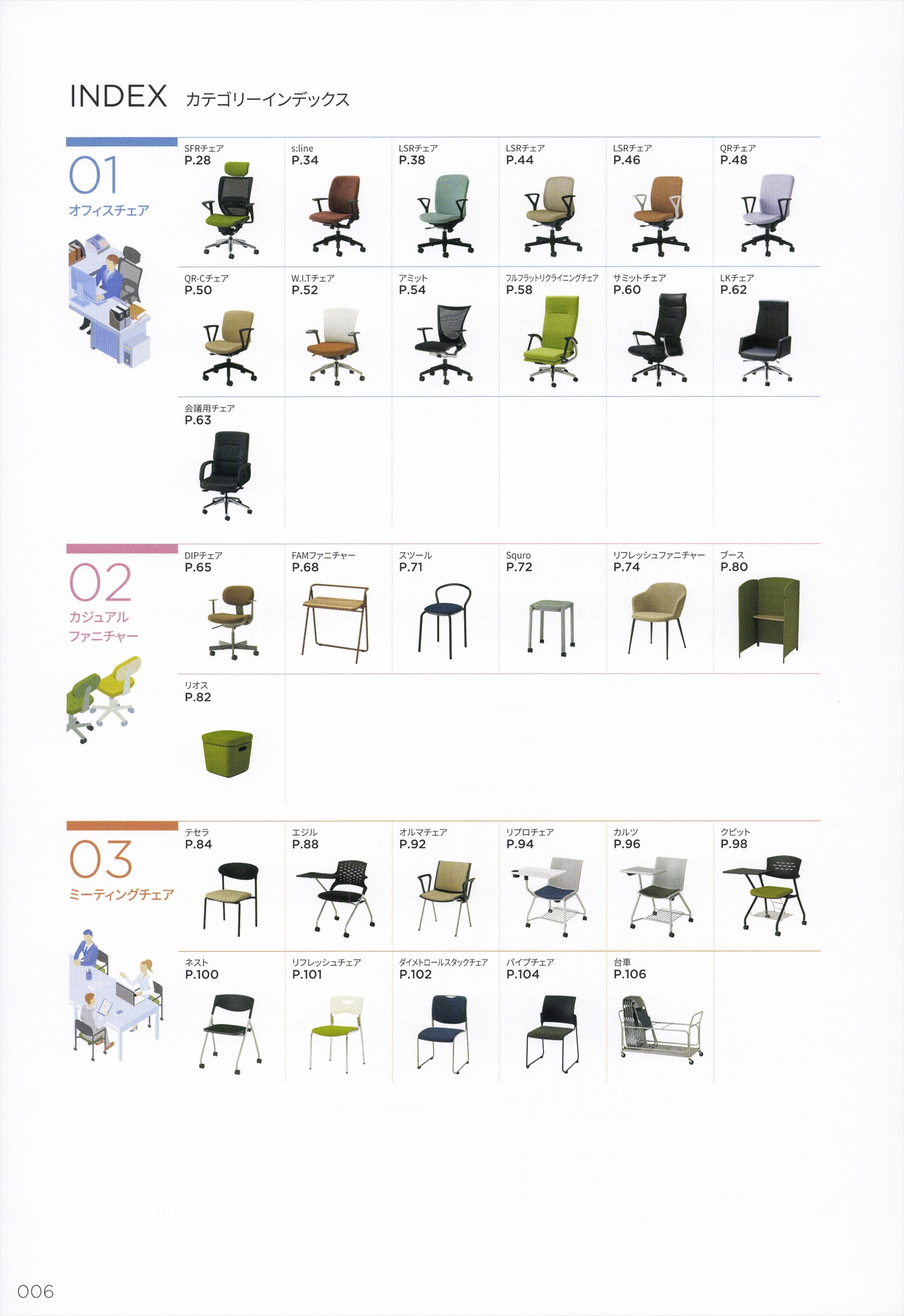 カテゴリーインデックス 01 オフィスチェア,02 カジュアルファニチャー,03 ミーティングチェア / 04 ワーキングチェア,05 ロビーチェア・屋外家具,06 パーティション,07 テーブル