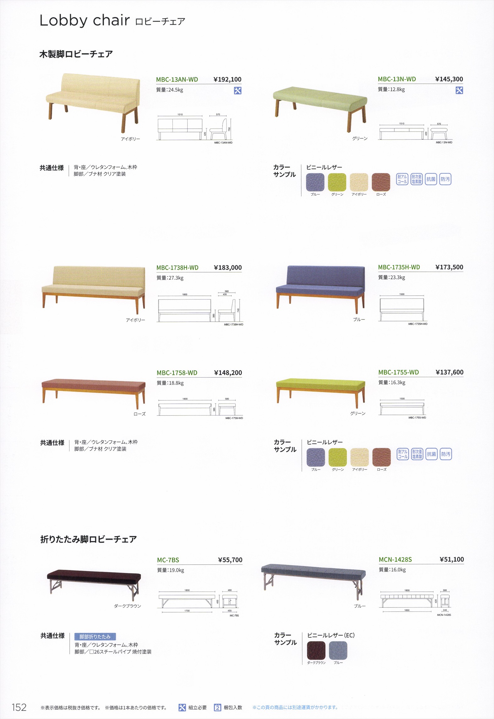 MCN-1428S(W1800) 折りたたみ脚 ロビーベンチ 張地選択