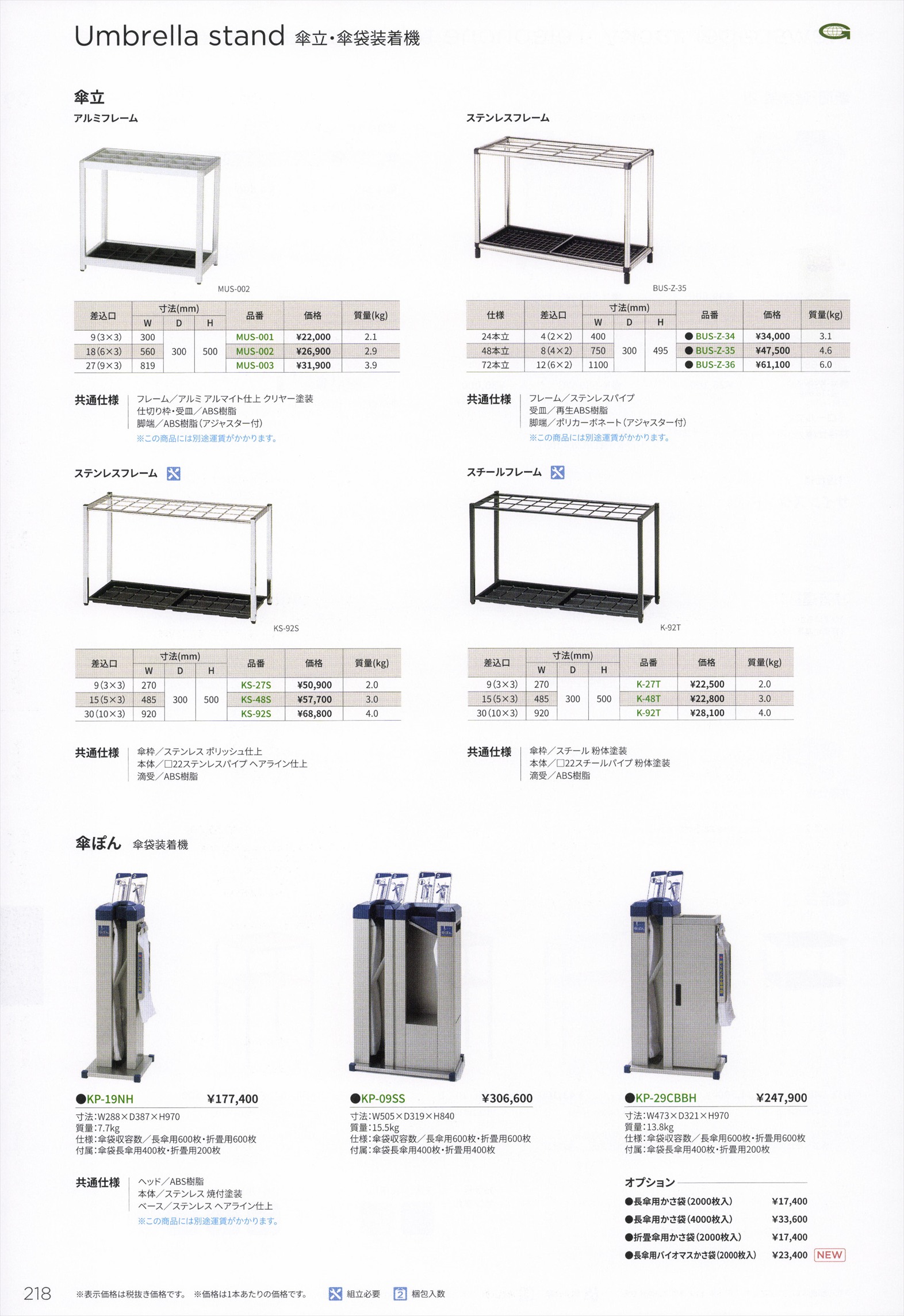 Umbrella stand(傘立・傘袋装着機) 傘立,傘ぽん 傘袋装着機 / Other equipment(その他備品) ダストポート,ロンステップマット,静音運搬車,ステップ付ピッキング台車,カラーカート